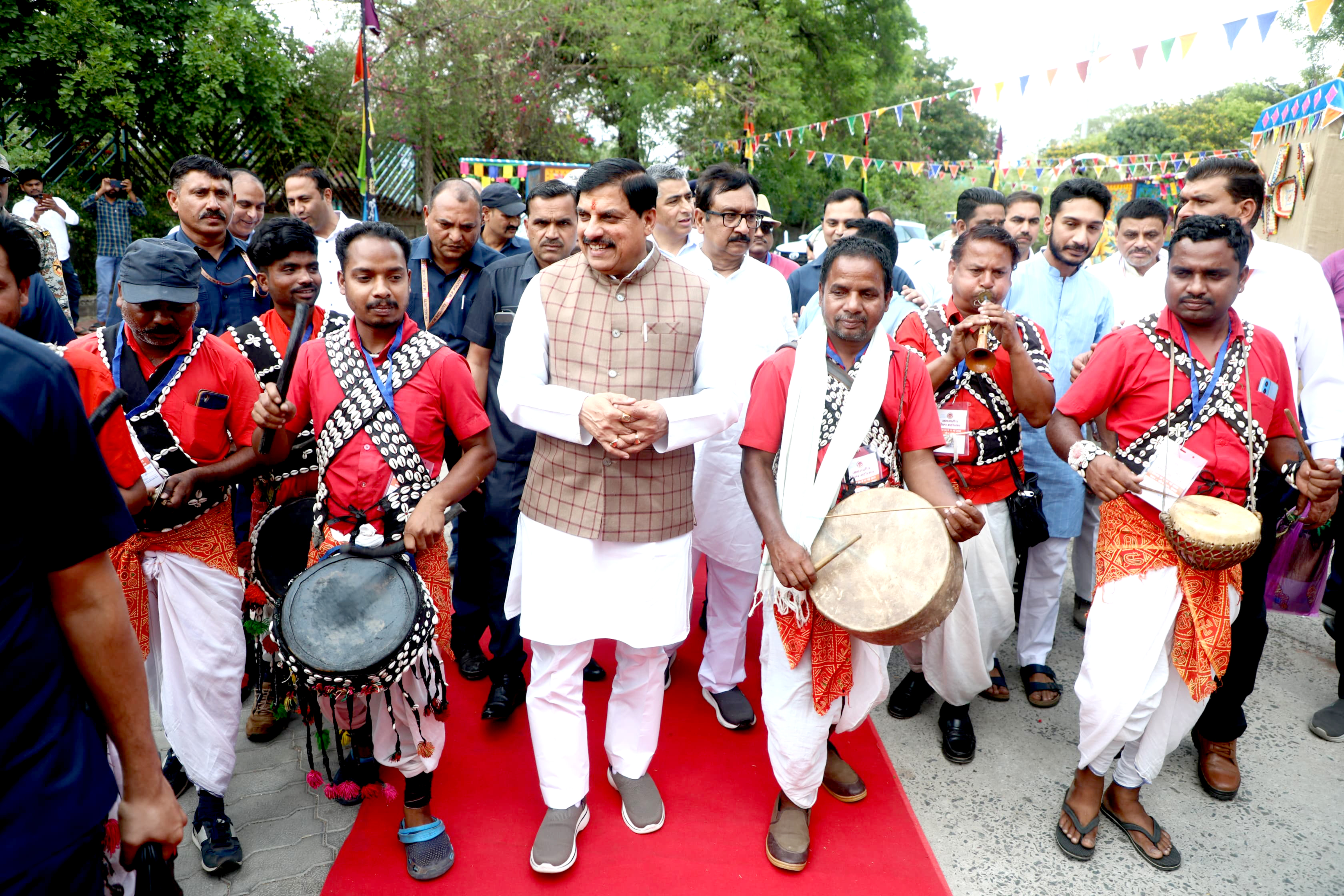 मुख्यमंत्री डॉ. मोहन यादव का जनजातीय शिल्पग्राम महोत्सव में जनजातीय बंधुओ ने पारंपरिक वाद्य यंत्रों के साथ स्वागत किया।