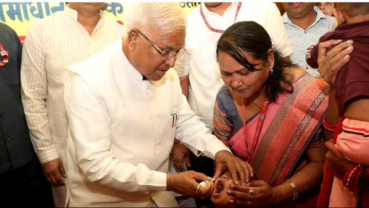राज्यपाल श्री मंगुभाई पटेल ने कटनी ज़िले के ग्राम हरदुआ में आदि सेवा केन्द्र का शुभारंभ कर जनजातीय बच्चों को पोलियों की दवा पिलाई।