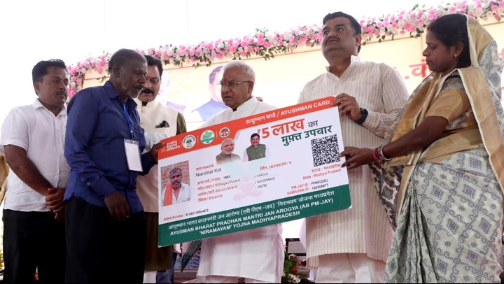 राज्यपाल श्री मंगुभाई पटेल ने कटनी ज़िले के स्लीमनाबाद में प्रवास के दौरान हितग्राहियों को आयुष्मान कार्ड वितरित किये।
