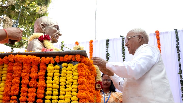राज्यपाल श्री मंगुभाई पटेल ने कटनी ज़िले के स्लीमनाबाद में आदि कर्मयोगी अभियान के अंतर्गत आदि साथी और आदि सहयोगियों से ग्रामीण जनसंवाद कार्यक्रम में महात्मा गांधी की प्रतिमा पर माल्यार्पण किया।
