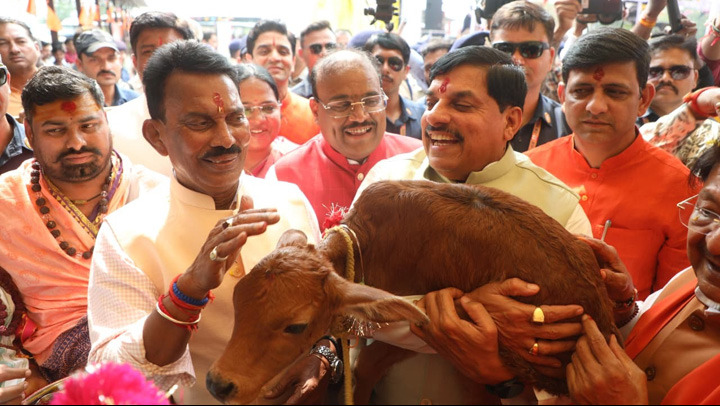 मुख्यमंत्री डॉ. मोहन यादव ने इंदौर के हातौद में रेशम केंद्र खजूरिया गौशाला में गोवर्धन पूजा के दौरान गौवंश का पूजन कर उन्हें दुलार किया।