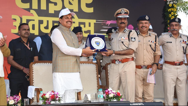 मुख्यमंत्री डॉ. मोहन यादव को अटल पथ पर "रन फॉर साइबर अवेयरनेस" के शुभारंभ अवसर पर डी जी पी श्री कैलाश मकवाना ने स्मृति चिन्ह भेंट किया।