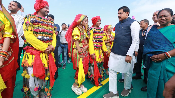 मुख्यमंत्री डॉ. मोहन यादव का प्रदेश के विभिन्न अंचलों से आए कलाकारों ने अपनी परंपरा अनुसार अभिवादन किया।