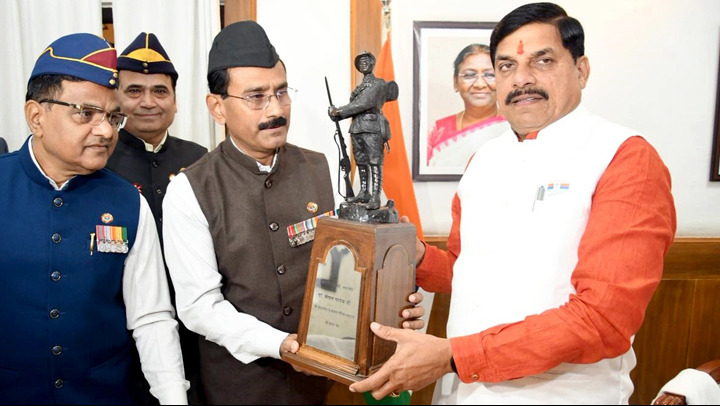 मुख्यमंत्री डॉ.मोहन यादव को सशस्त्र सेना झंडा दिवस पर संचालक सैनिक कल्याण बोर्ड ब्रिगेडियर अरुण नायर सेना मेडल (से.नि.) ने मोमेंटो भेंट किया।