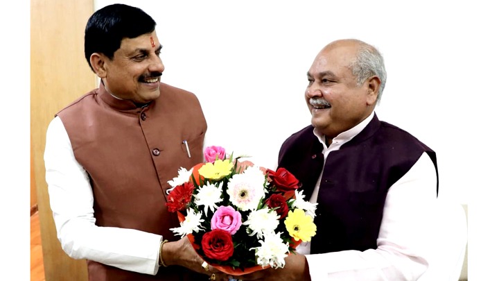 मुख्यमंत्री डॉ मोहन यादव ने सरकार के 2 वर्ष पूर्ण होने पर विधानसभा पहुंचकर विधानसभा अध्यक्ष श्री नरेंद्र सिंह तोमर से सौजन्य भेंट की। विधानसभा अध्यक्ष श्री तोमर ने मुख्यमंत्री डॉ यादव को पुष्प गुच्छ भेंट कर शुभकामनाएं दीं।
