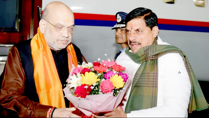 पूर्व प्रधानमंत्री भारत रत्न अटल बिहारी वाजपेई की 101 वीं जन्म जयंती पर गुरुवार को ग्वालियर में आयोजित अभ्युदय मध्यप्रदेश ग्रोथ समिट में केंद्रीय गृहमंत्री श्री अमित शाह का स्वागत करते हुए मुख्यमंत्री डॉ. मोहन यादव।
