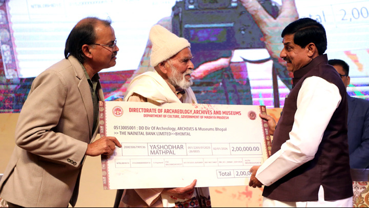 मुख्यमंत्री डॉ.मोहन यादव ने ख्यातनाम पुरातत्वविद डॉ. यशोधर मठपाल को प्रशस्ति पत्र के साथ 2 लाख रूपए का चेक भेंट कर 19 वें डॉ. विष्णु श्रीधर वाकणकर राष्ट्रीय सम्मान से सम्मानित किया।
