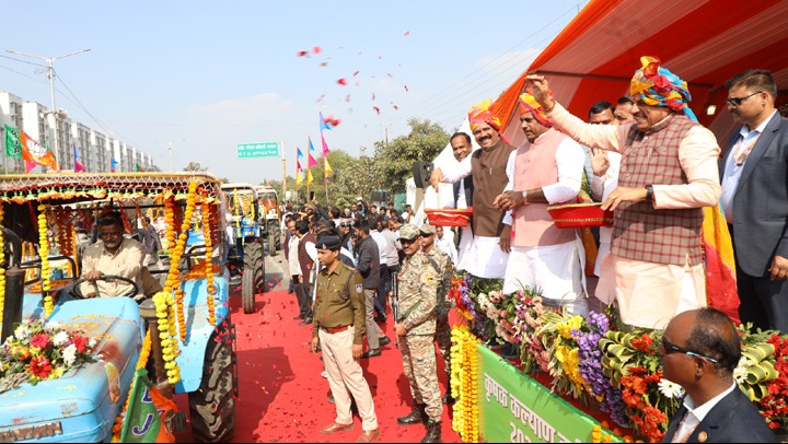 मुख्यमंत्री डॉ. मोहन यादव ने कृषक कल्याण वर्ष-2026 के शुभारंभ अवसर पर निकली कृषि रथ एवं ट्रैक्टरों की भव्य रैली का पुष्प वर्षा कर किसानों का स्वागत किया।