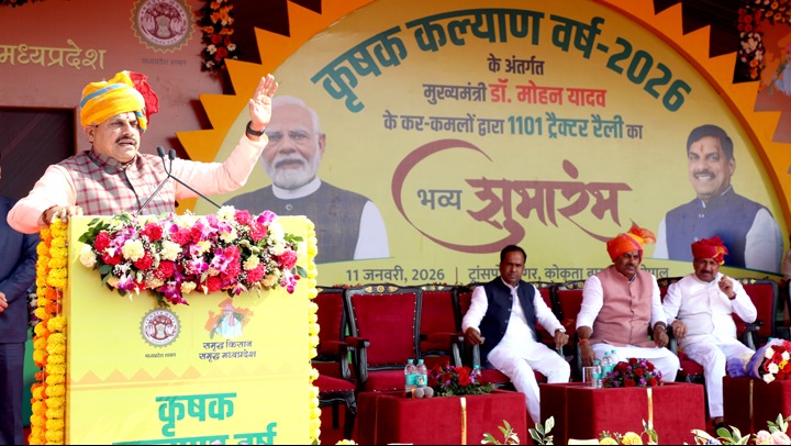 मुख्यमंत्री डॉ. मोहन यादव ने कृषक कल्याण वर्ष-2026 के शुभारंभ अवसर पर कोकता बायपास रोड से कृषि रथ एवं ट्रैक्टरों की भव्य रैली को संबोधित किया।