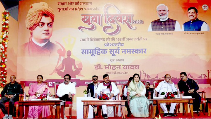 मुख्यमंत्री डॉ. मोहन यादव स्वामी विवेकानंद जयंती "युवा दिवस" पर भोपाल में आयोजित राज्य स्तरीय सामूहिक सूर्य नमस्कार कार्यक्रम में शामिल हुए।