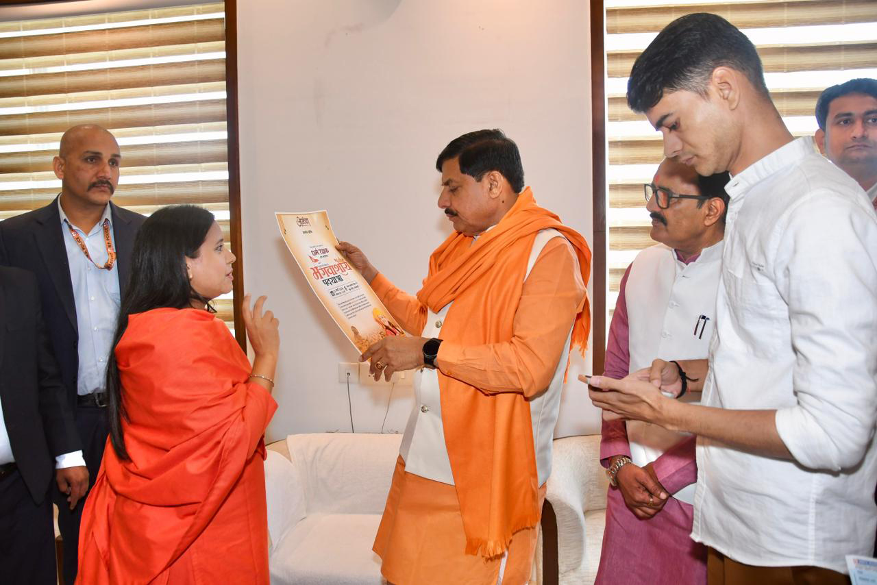 मुख्यमंत्री डॉ. मोहन यादव से मंगलवार को विधानसभा में मुख्यमंत्री प्रतिकक्ष में साध्वी सरस्वती जी ने सौजन्य भेंट कर भोपाल के लालघाटी के धार्मिक कार्यक्रम में आमंत्रित किया।