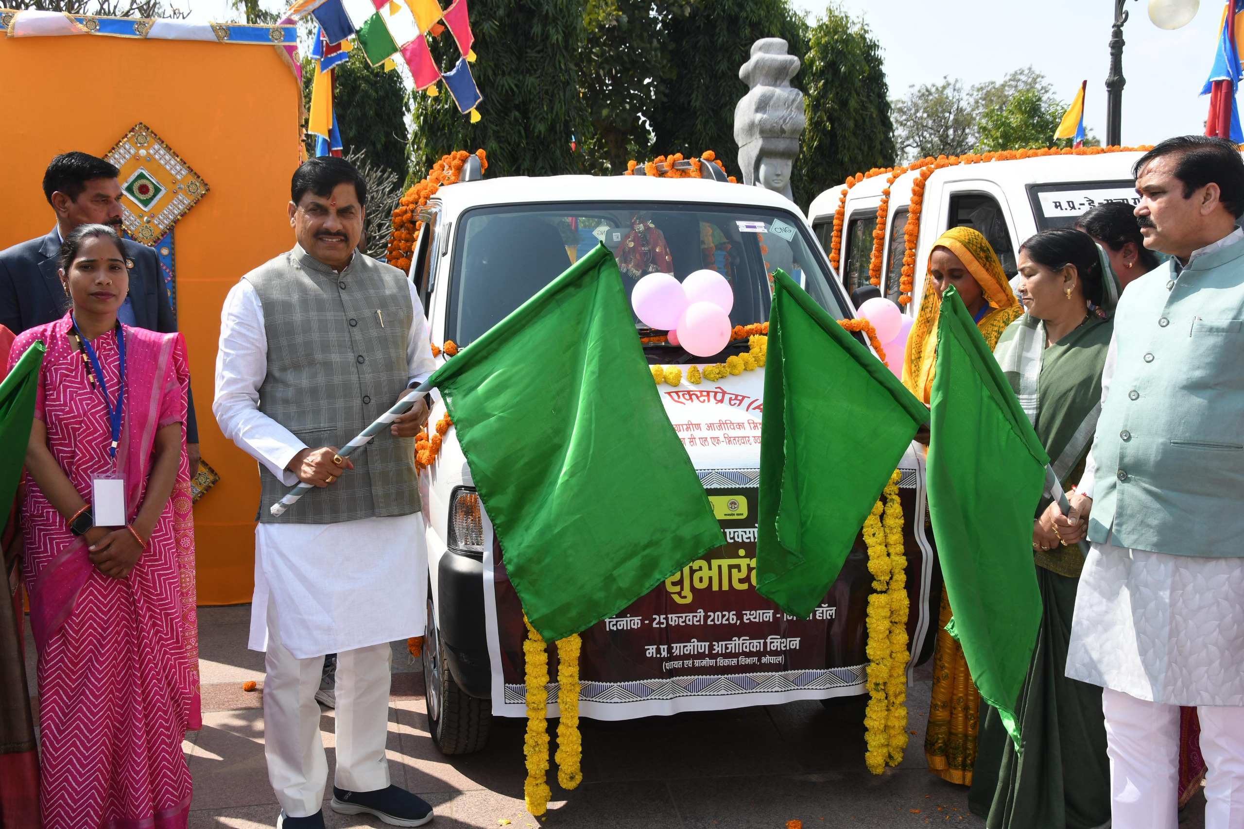 मुख्यमंत्री डॉ. मोहन यादव ने आजीविका ग्रामीण एक्सप्रेस योजना के 7 वाहनों को झंडी दिखाकर रवाना किया ।