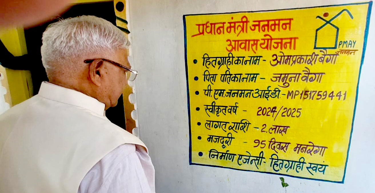 राज्यपाल श्री मंगुभाई पटेल ने सीधी जिले के ग्राम परसिली में प्रधानमंत्री जनमन आवास योजना के हितग्राही ओम प्रकाश बैगा के घर पहुँचे।