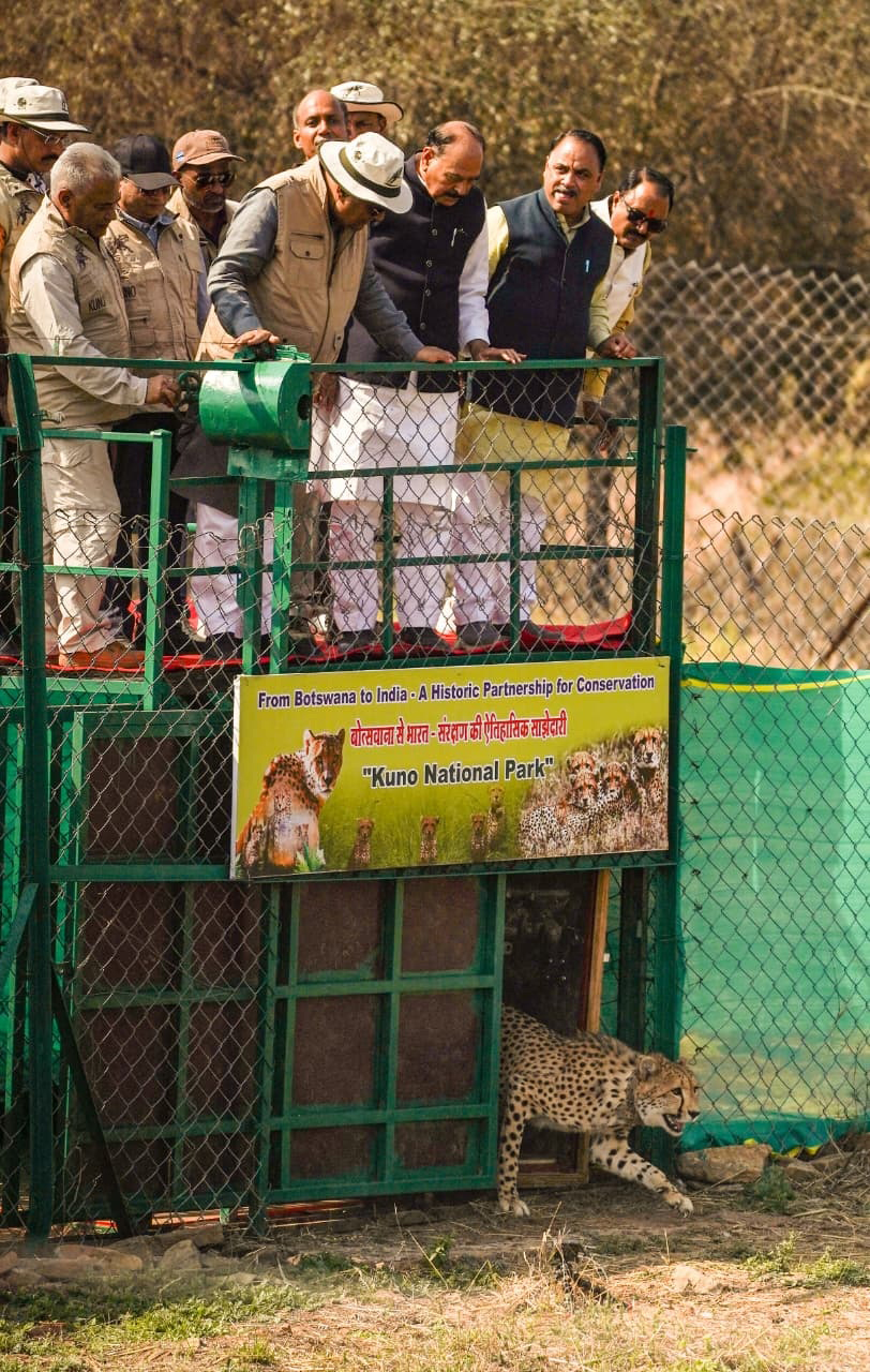 केंद्रीय वन मंत्री श्री भूपेंद्र यादव ने बोत्सवाना से लाए गए चीतों को कूनो नेशनल पार्क के क्वारंटाइन बाड़े में छोड़ा।