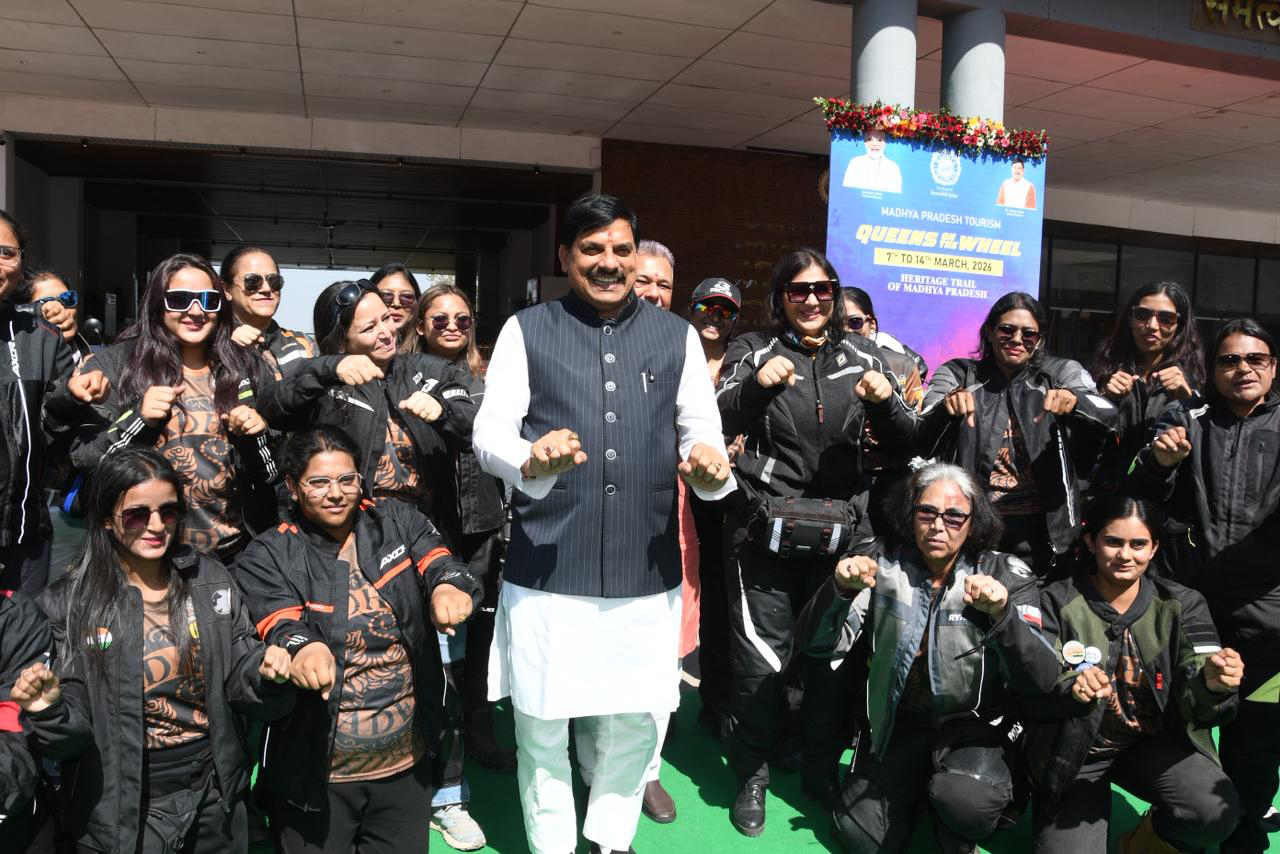 मुख्यमंत्री डॉ. मोहन यादव 25 महिला सुपर बाइकर्स (क्वीन्स ऑन द व्हील) के साथ मुख्यमंत्री निवास में।