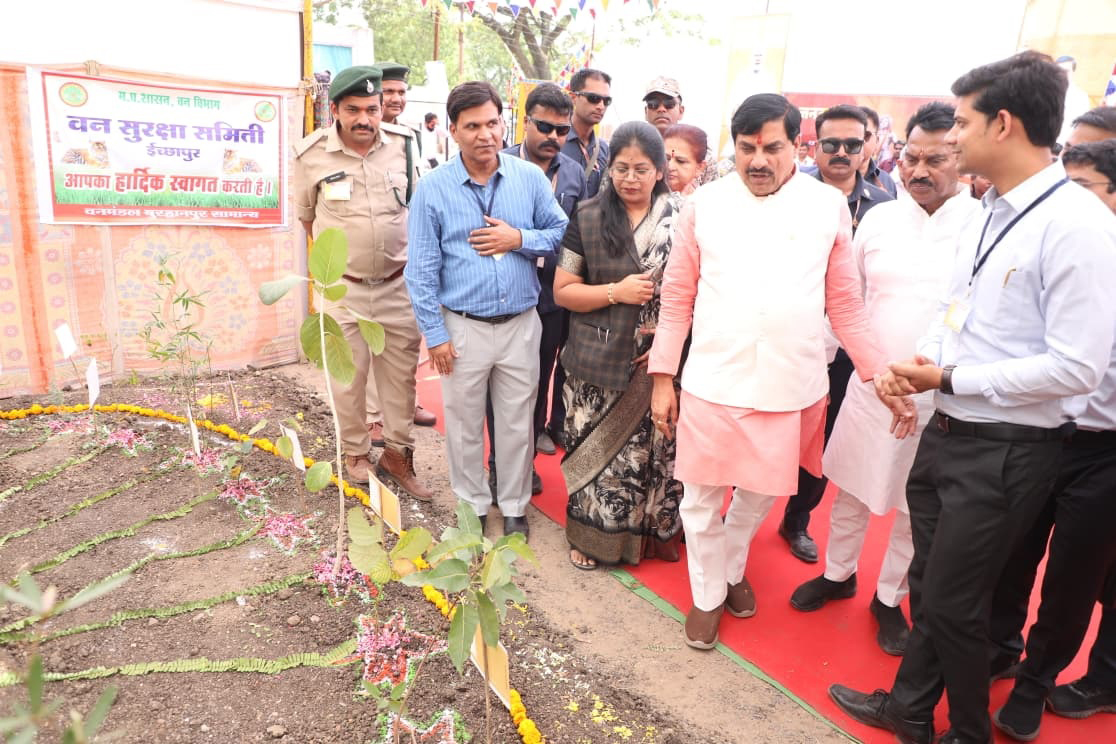 मुख्यमंत्री डॉ. मोहन यादव ने नेपानगर में आयोजित जनजातीय सम्मेलन में वन सुरक्षा समिति द्वारा तैयार किये गए मॉडल का अवलोकन किया।