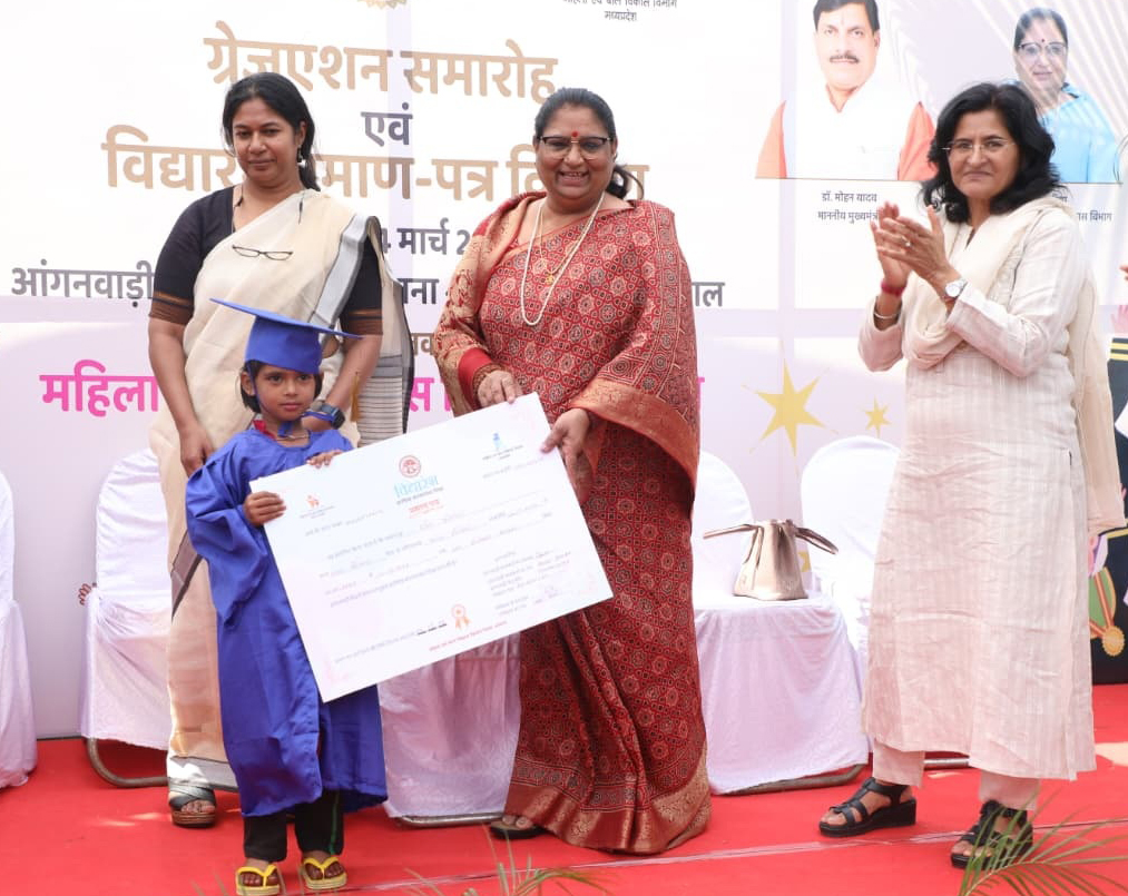 महिला बाल विकस मंत्री सुश्री निर्मला भूरिया ने नेहरू नगर स्थित आंगनवाडी केन्द्र मे बच्चों को विद्यारम्भ प्रमाण पत्र वितरित किया।