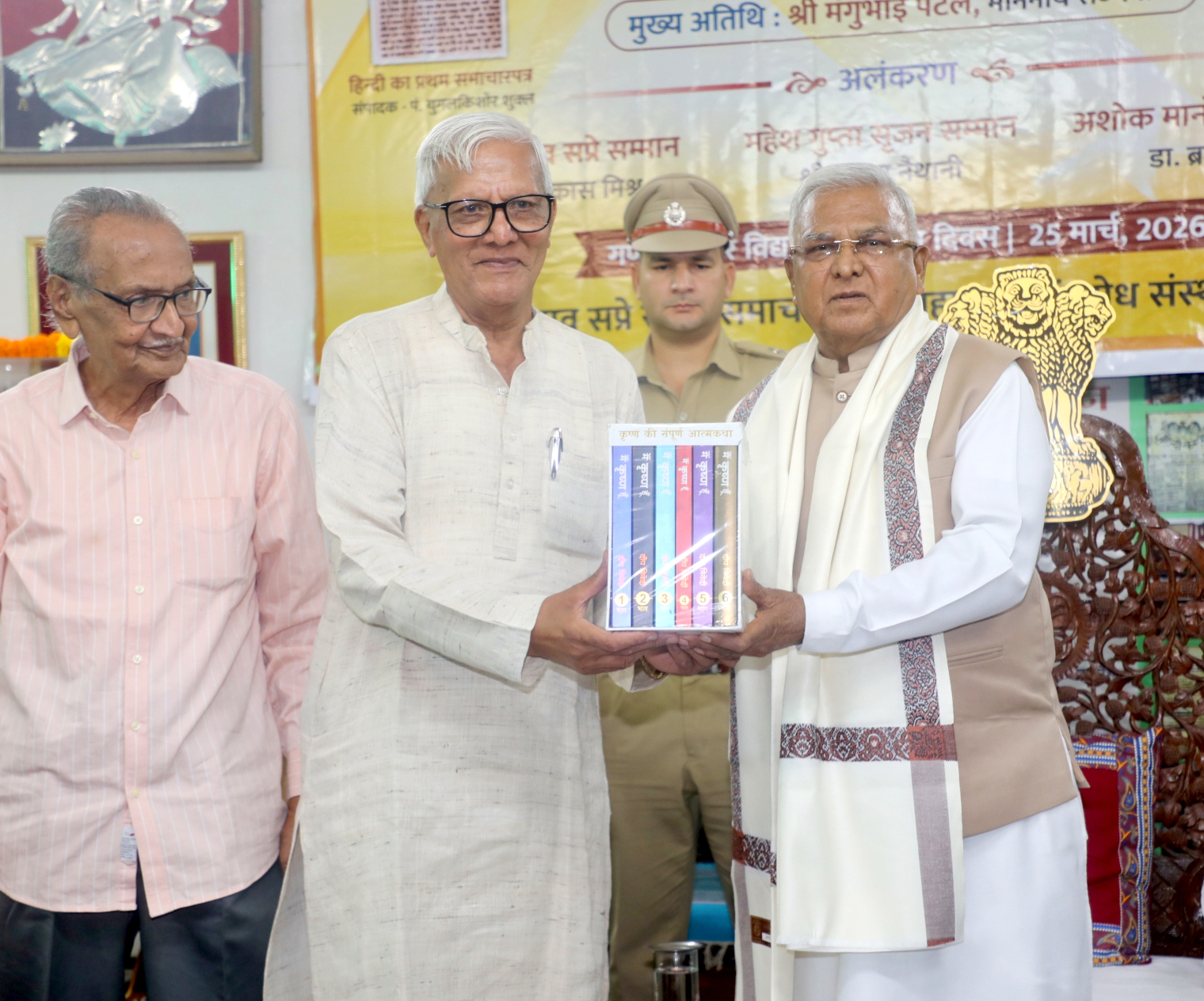 राज्यपाल श्री मंगुभाई पटेल का माधवराव सप्रे स्मृति समाचार पत्र संग्रहालय एवं शोध संस्थान भोपाल में हिन्दी पत्रकारिता के 200 वर्ष पूर्ण होने के अवसर पर आयोजित कार्यक्रम में अंगवस्त्र एवं ग्रंथ भेंट कर अभिनंदन किया गया।
