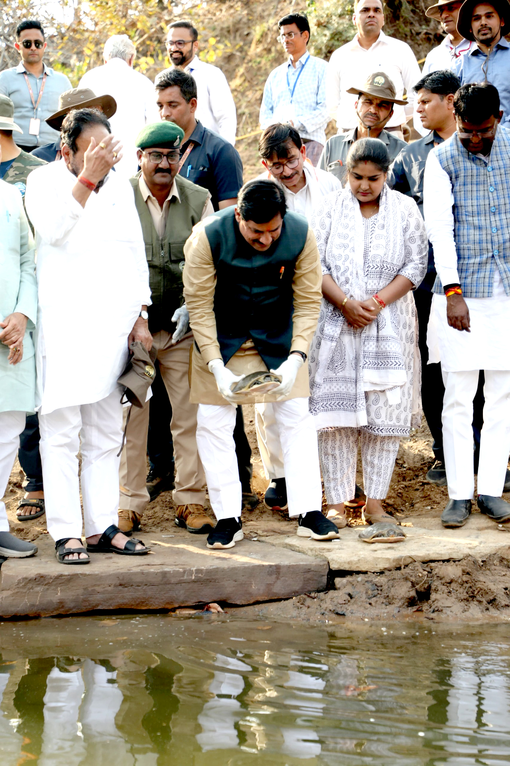 मुख्यमंत्री डॉ. मोहन यादव ने वीरांगना दुर्गावती टाइगर रिजर्व की बामनेर नदी में कछुए छोड़े।
