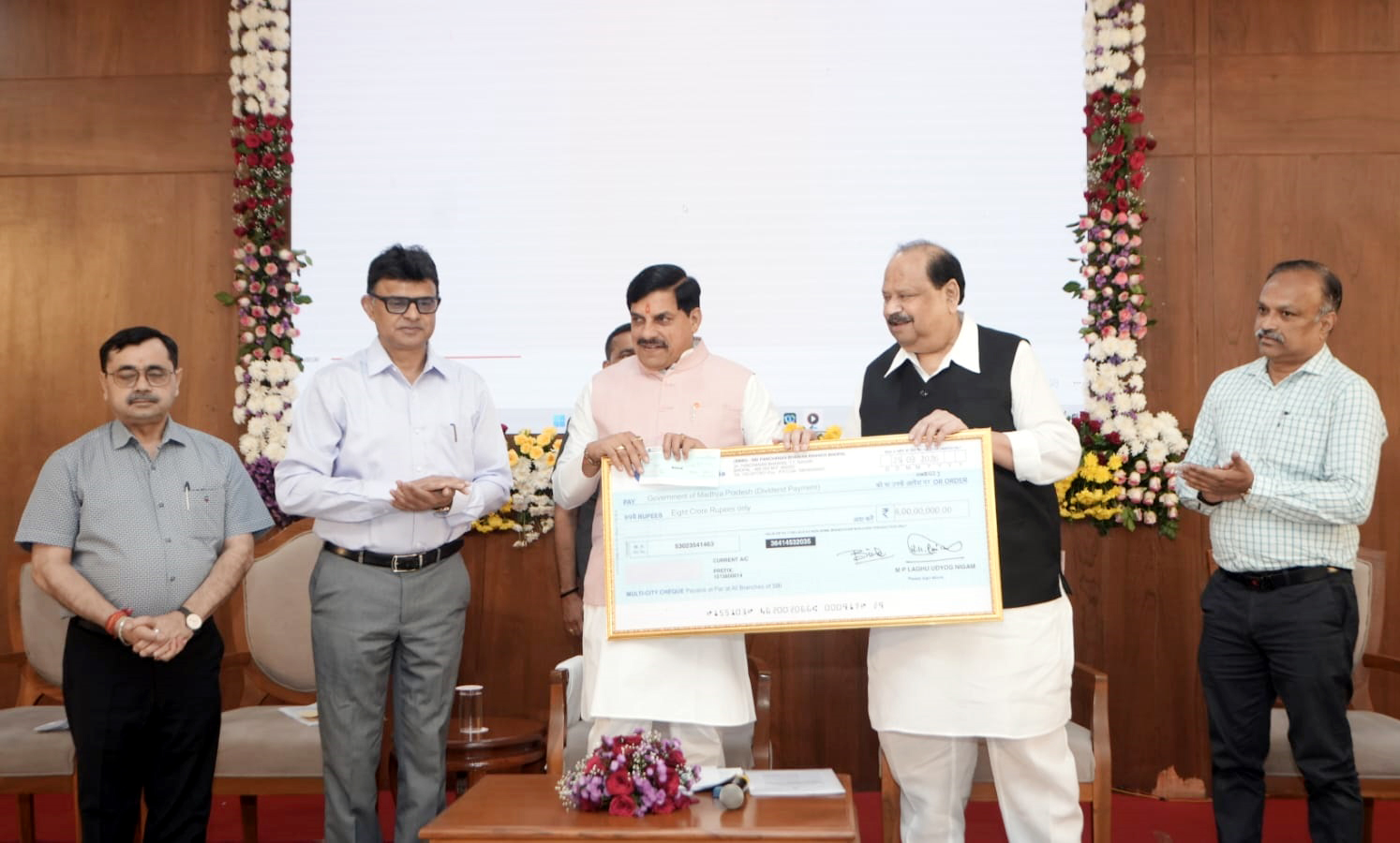 मुख्यमंत्री डॉ. मोहन यादव को एमएसएमई मंत्री श्री चेतन्य कुमार काश्यप ने लघु उद्योग निगम के अंतरिम लाभांश की 8 करोड़ रुपए की राशि का चेक सौंपा।