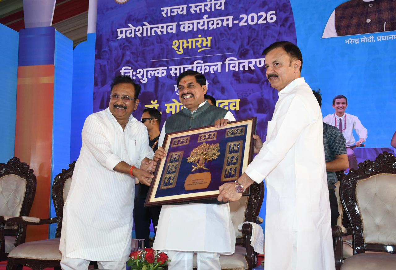 मुख्यमंत्री डॉ. मोहन यादव को "स्कूल चले हम" अभियान अंतर्गत भोपाल में राज्य स्तरीय प्रवेशोत्सव कार्यक्रम-2026 में जनजाति मंत्री डॉ. विजय शाह और स्कूल शिक्षा एवं परिवहन मंत्री श्री उदय प्रताप सिंह ने स्मृति चिन्ह भेंट किया।