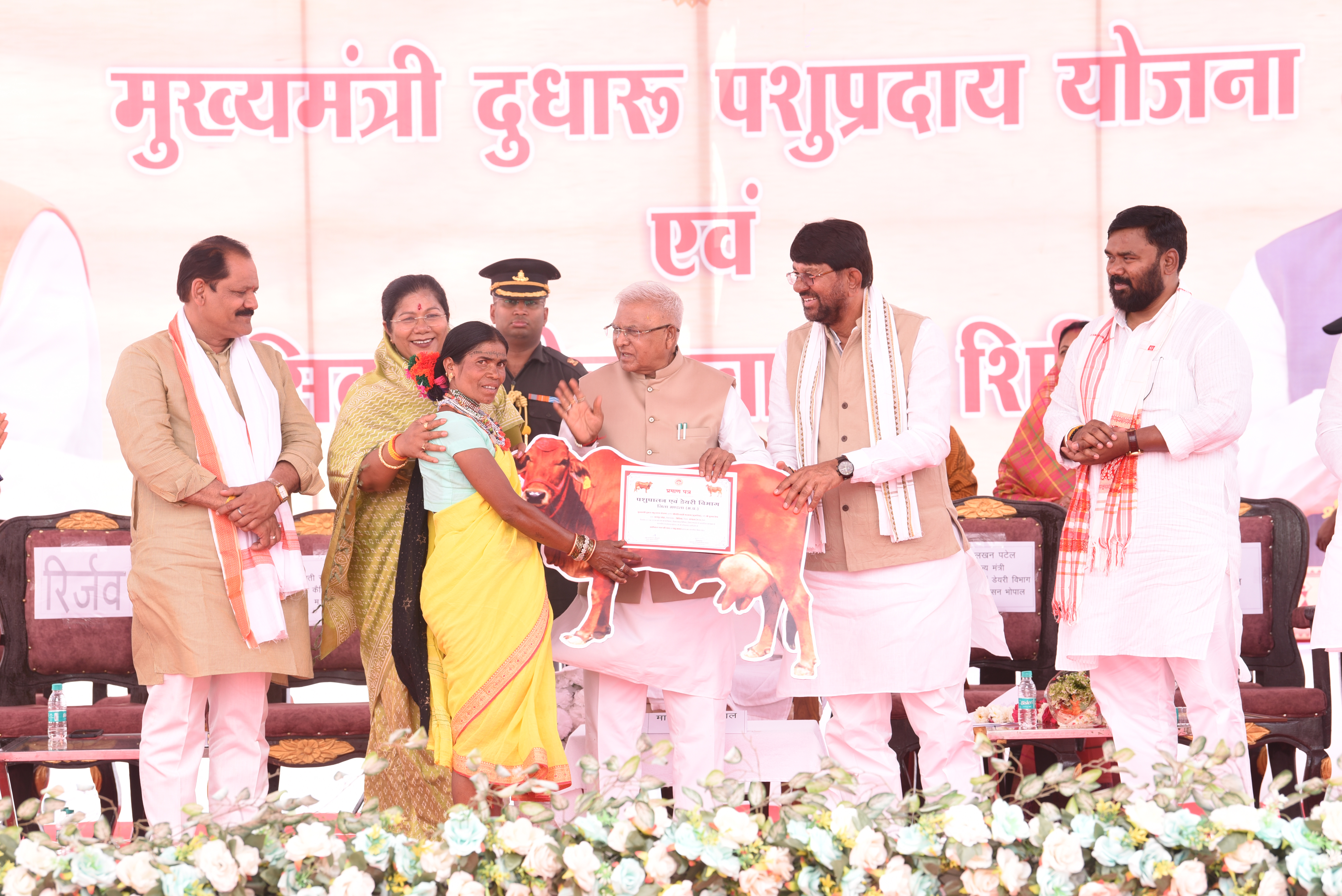 राज्यपाल श्री मंगुभाई पटेल ने मण्डला जिले ग्राम कन्हारी कला में मुख्यमंत्री दुधारू पशु प्रदाय योजना एवं सिकल सेल स्वास्थ्य शिविर में हितग्राहियों को हितलाभ वितरित किये।