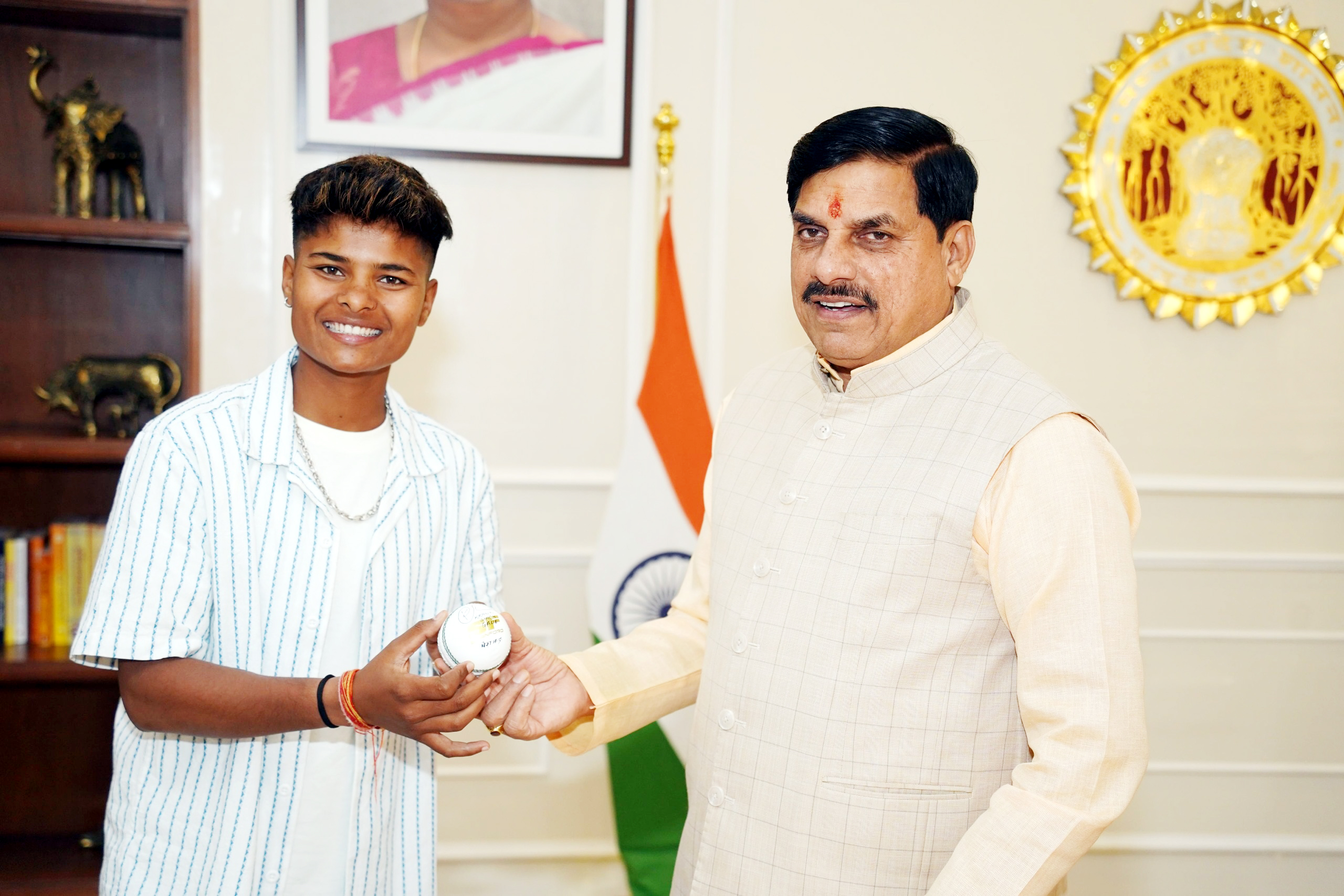मुख्यमंत्री डॉ. मोहन यादव को भारतीय महिला क्रिकेट टीम की सदस्य क्रांति गौड़ ने गुरुवार को मुख्यमंत्री निवास में अपने ऑटोग्राफ वाली क्रिकेट बॉल भेंट की।