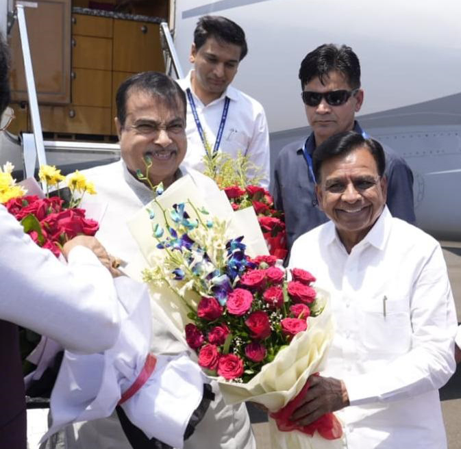 उप मुख्यमंत्री श्री जगदीश देवड़ा ने सोमवार को केन्द्रीय परिवहन मंत्री श्री नितिन गडकरी का स्टेट हैंगर पर पुष्पगुच्छ से स्वागत किया।