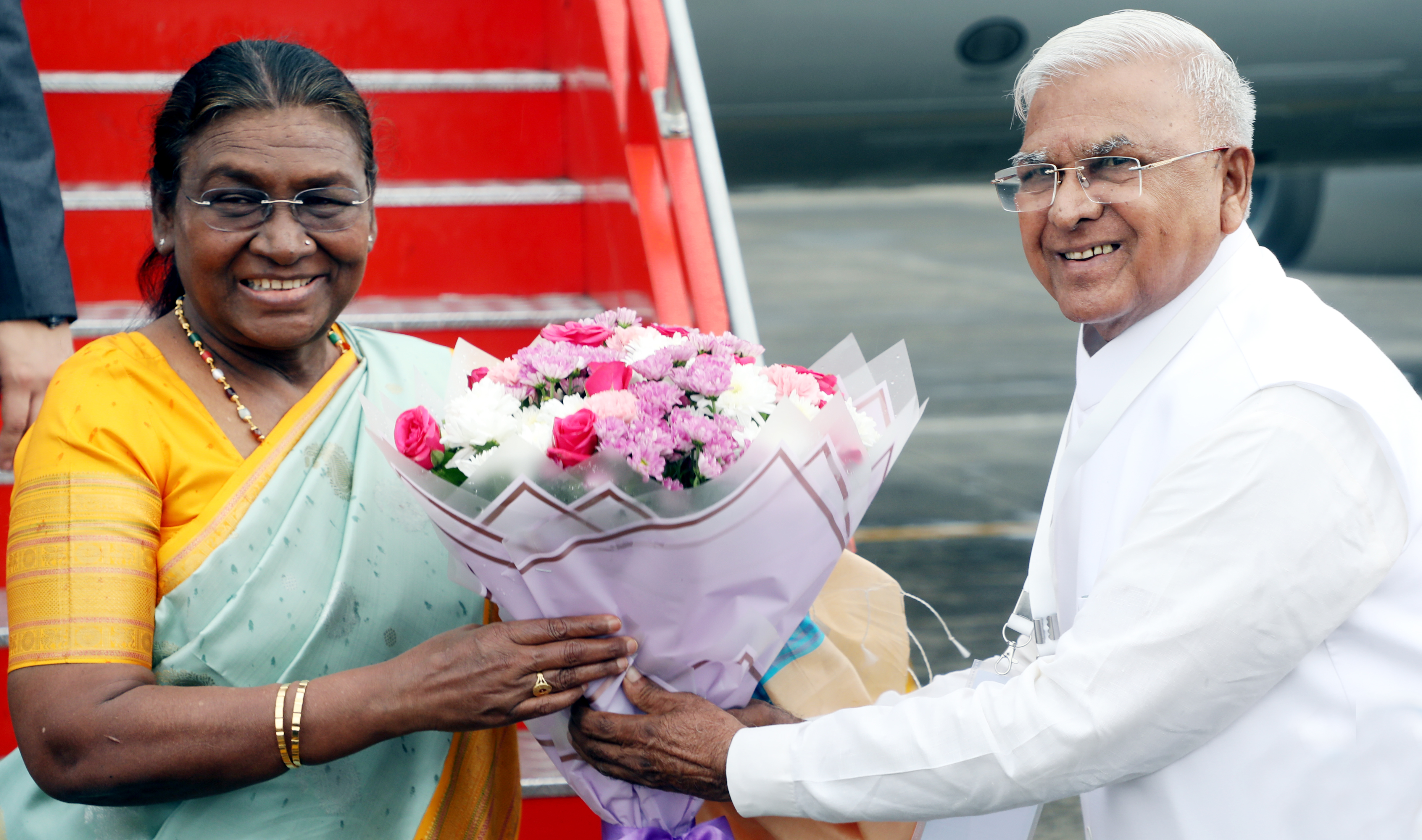 राष्ट्रपति श्रीमती द्रौपदी मुर्मु का इंदौर विमानतल पर राज्यपाल श्री मंगुभाई पटेल ने स्वागत किया।