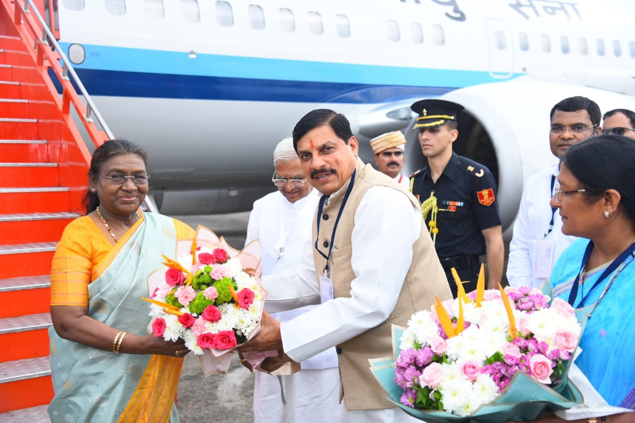राष्ट्रपति श्रीमती द्रौपदी मुर्मु का इंदौर विमानतल पर मुख्यमंत्री डॉ. मोहन यादव ने स्वागत किया।