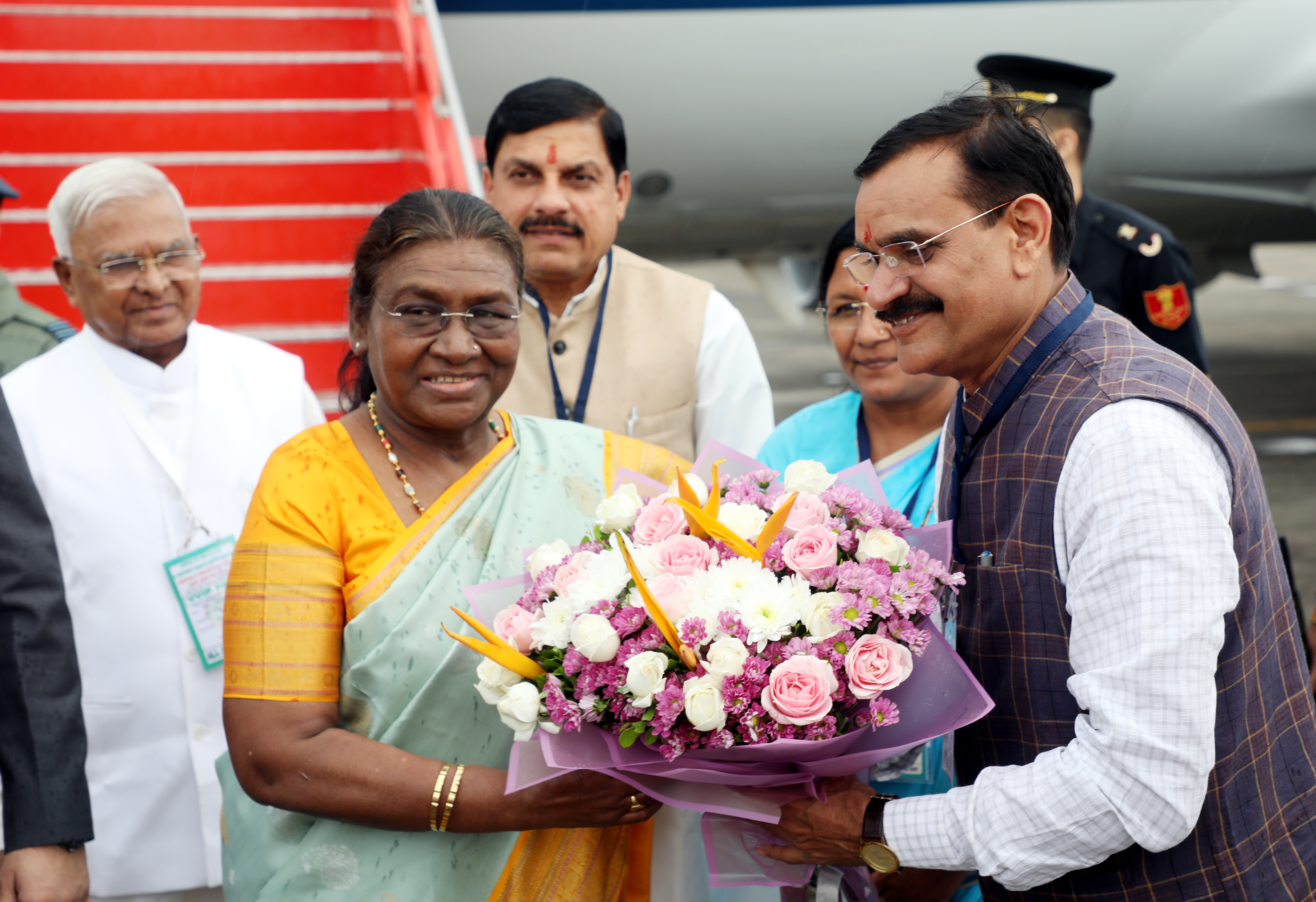 राष्ट्रपति श्रीमती द्रौपदी मुर्मु का इंदौर विमानतल पर खजुराहो सांसद श्री वीडी शर्मा ने स्वागत किया।