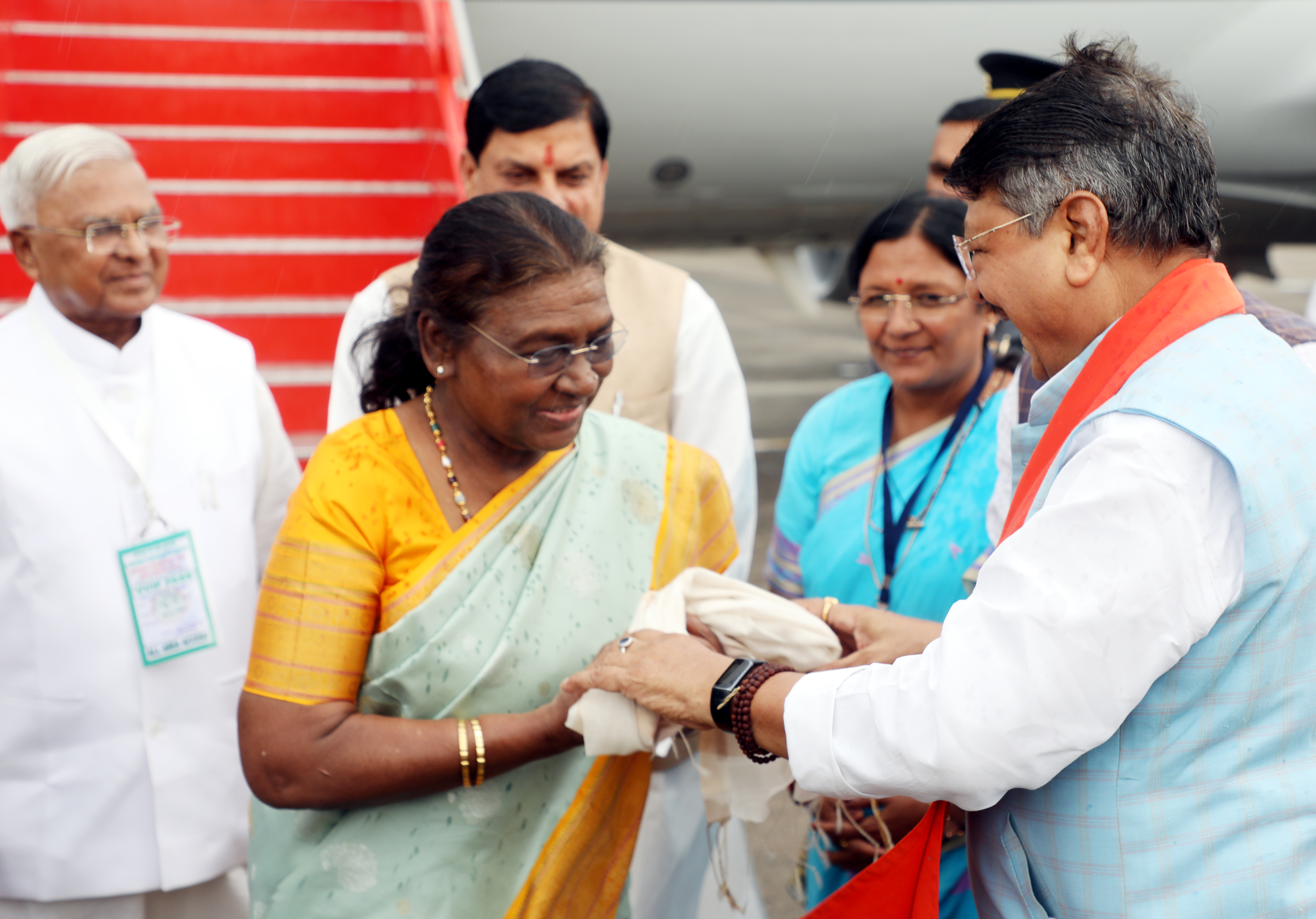 राष्ट्रपति श्रीमती द्रौपदी मुर्मु का इंदौर विमानतल पर नगरीय विकास एवं आवास मंत्री श्री कैलाश विजयवर्गीय ने स्वागत किया।