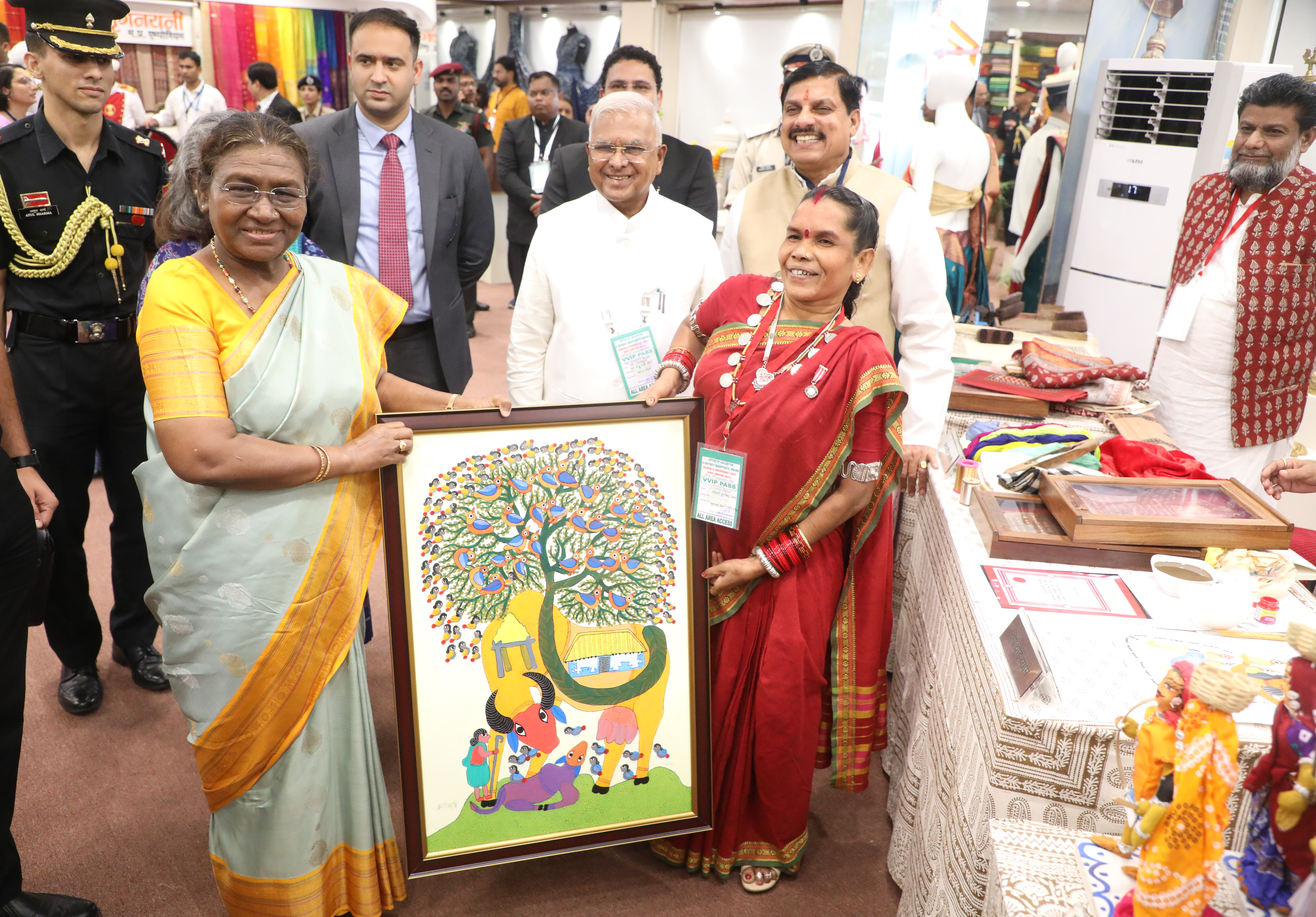 राष्ट्रपति श्रीमती द्रौपदी मुर्मु को मृगनयनी एम्पोरियम इंदौर में गोंडी पेंटिंग्स की चित्रकार श्रीमती दुर्गाबाई श्याम ने पेन्टिंग भेंट की।