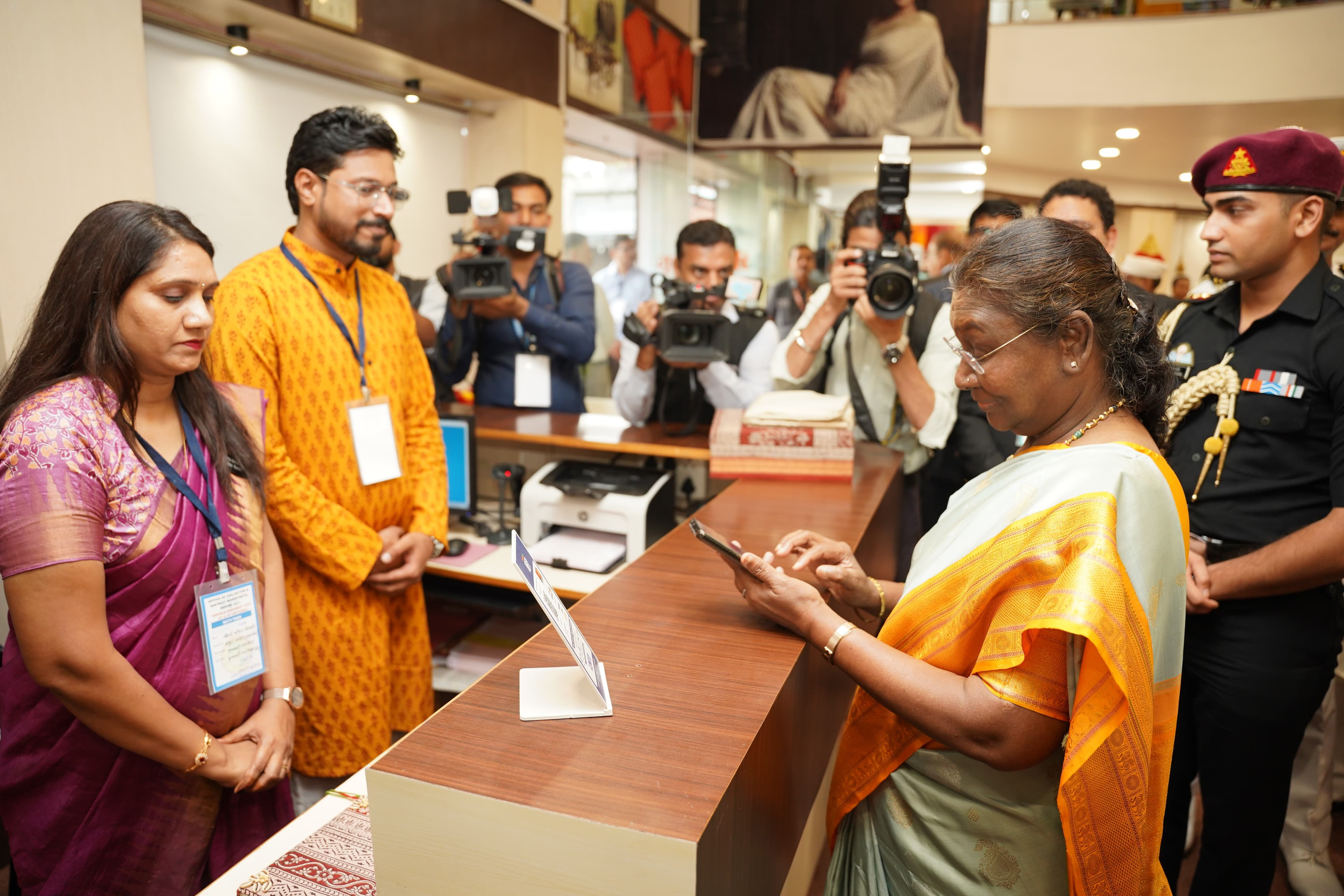 राष्ट्रपति श्रीमती द्रौपदी मुर्मु ने मृगनयनी एंपोरियम इंदौर में क्रय सामग्री का डिजिटल भुगतान किया।