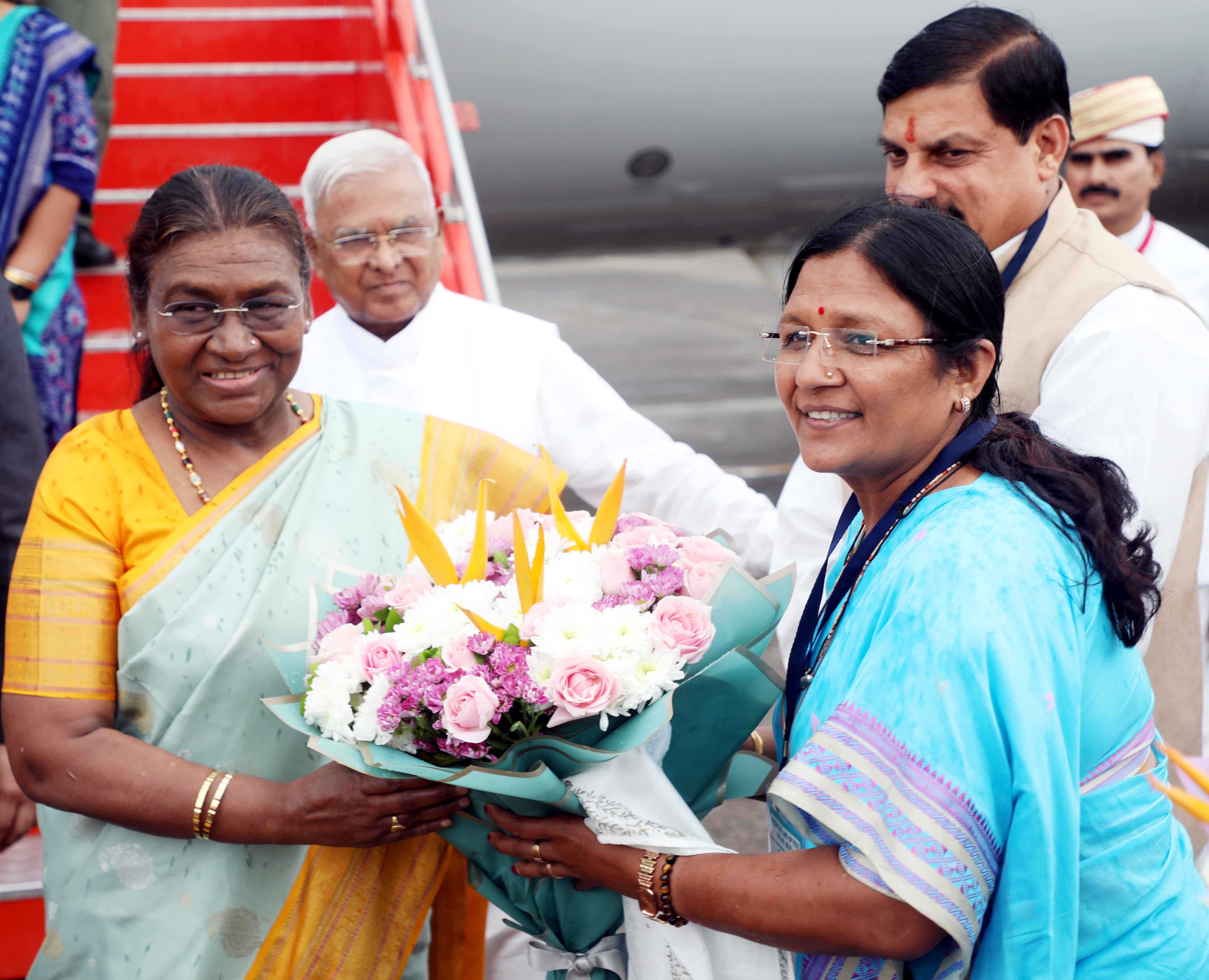 राष्ट्रपति श्रीमती द्रौपदी मुर्मु का इंदौर विमानतल पर केंद्रीय महिला एवं बाल विकास राज्य मंत्री श्रीमती सावित्री ठाकुर ने स्वागत किया।