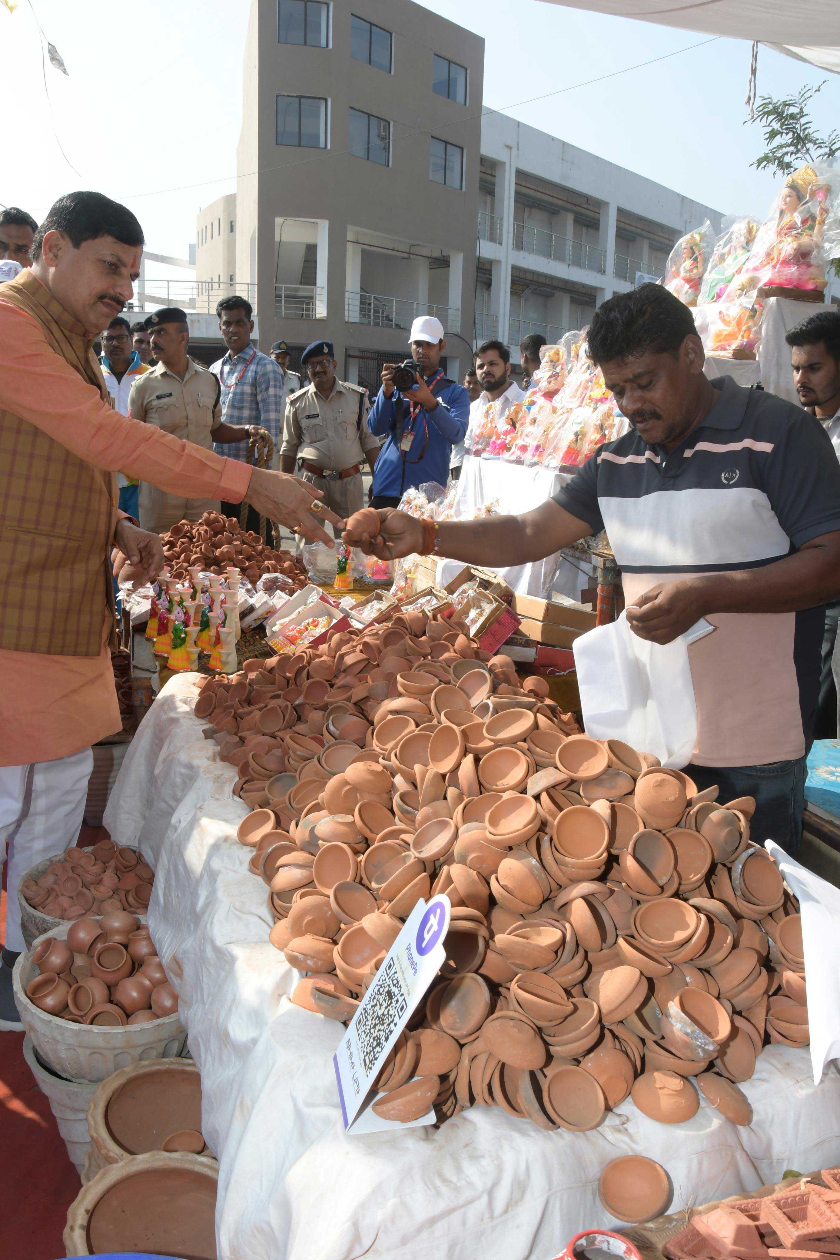 मुख्यमंत्री डॉ.मोहन यादव ने टीटी नगर स्टेडियम भोपाल में मिट्टी के दीये और लक्ष्मी व गणेश की मूर्ति की खरीदारी की।