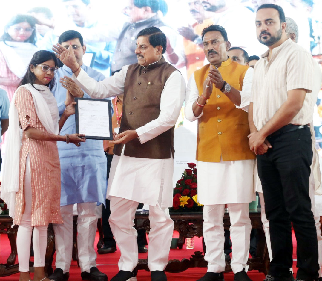 मुख्यमंत्री डॉ. मोहन यादव ने इंदौर के ग्रामीण हाट बाजार में आयोजित कार्यक्रम में एसिड अटैक सरवाइवर युवती को रोजगार प्रमाण पत्र प्रदान किया।