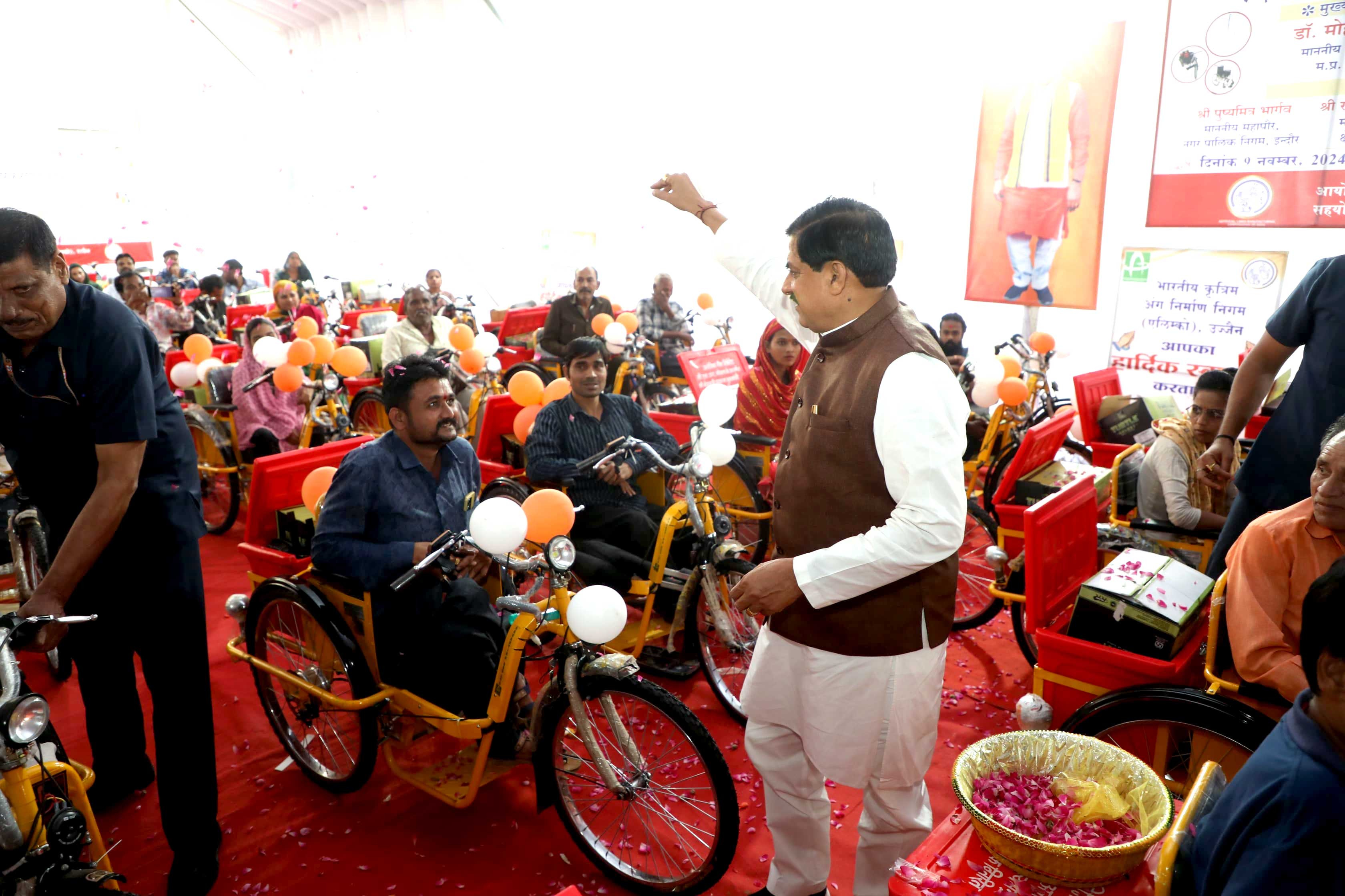 मुख्यमंत्री डॉ. मोहन यादव इंदौर के ग्रामीण हाट बाजार में आयोजित कार्यक्रम में दिव्यांगजनों पर पुष्प-वर्षा करते हुए।