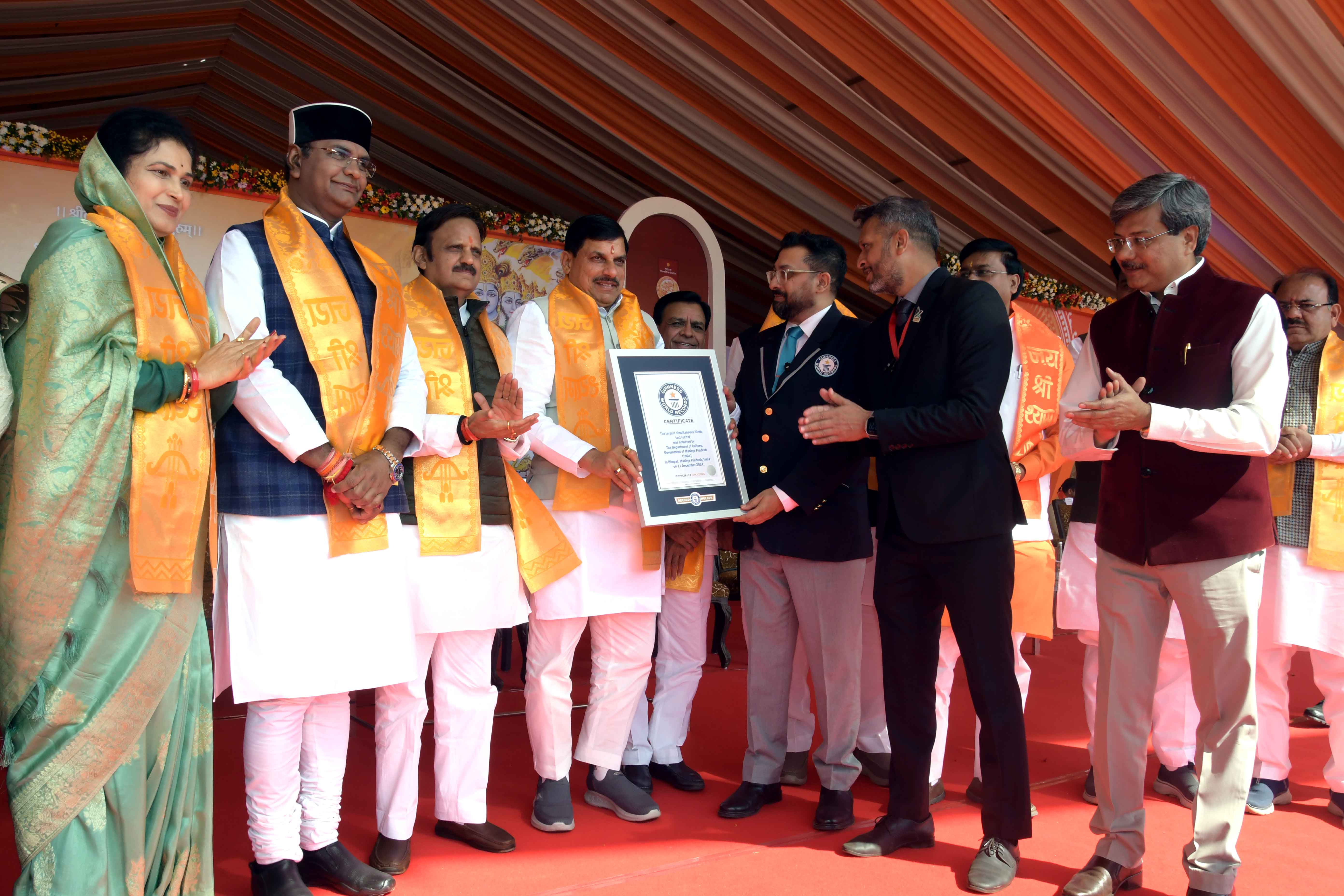 मुख्यमंत्री डॉ.मोहन यादव को "गीता महोत्सव" में हजारों आचार्यों द्वारा सस्वर गीता पाठ करने पर गिनीज बुक ऑफ़ वर्ल्ड रिकार्ड्स का सर्टिफिकेट सौंपा।