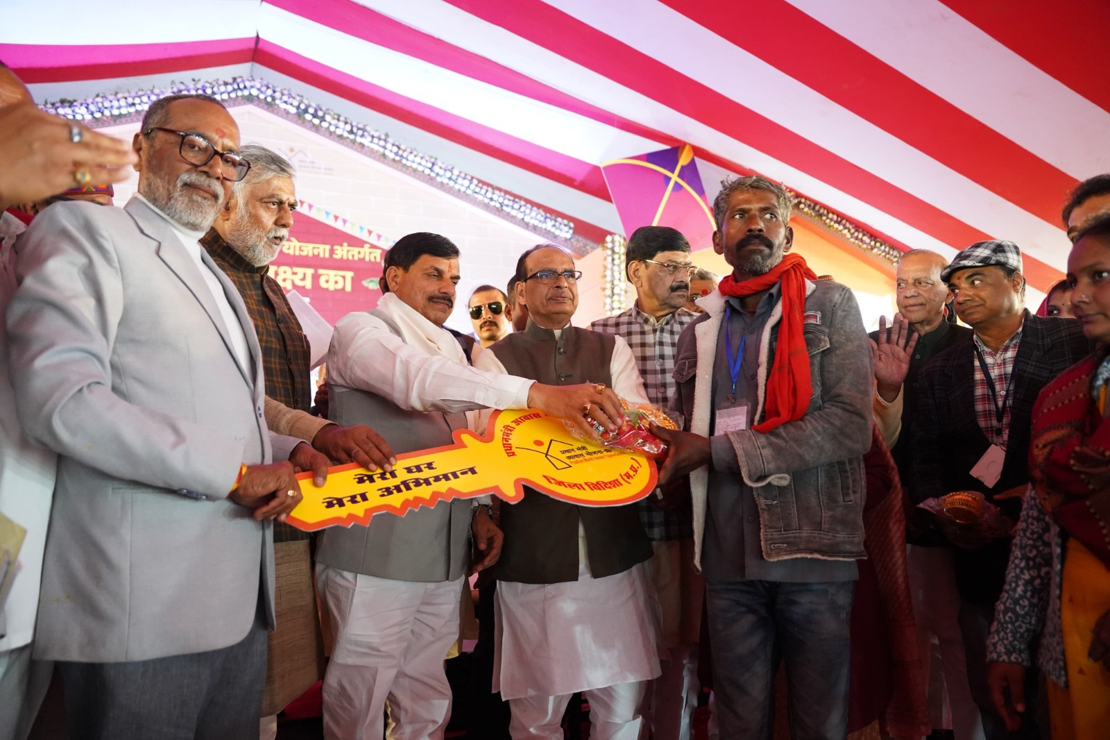 मुख्यमंत्री डॉ. मोहन यादव ने विदिशा में आवास योजना के हितग्राहियों को प्रतीकात्मक चाबी सौंप कर गृह प्रवेश कराया।