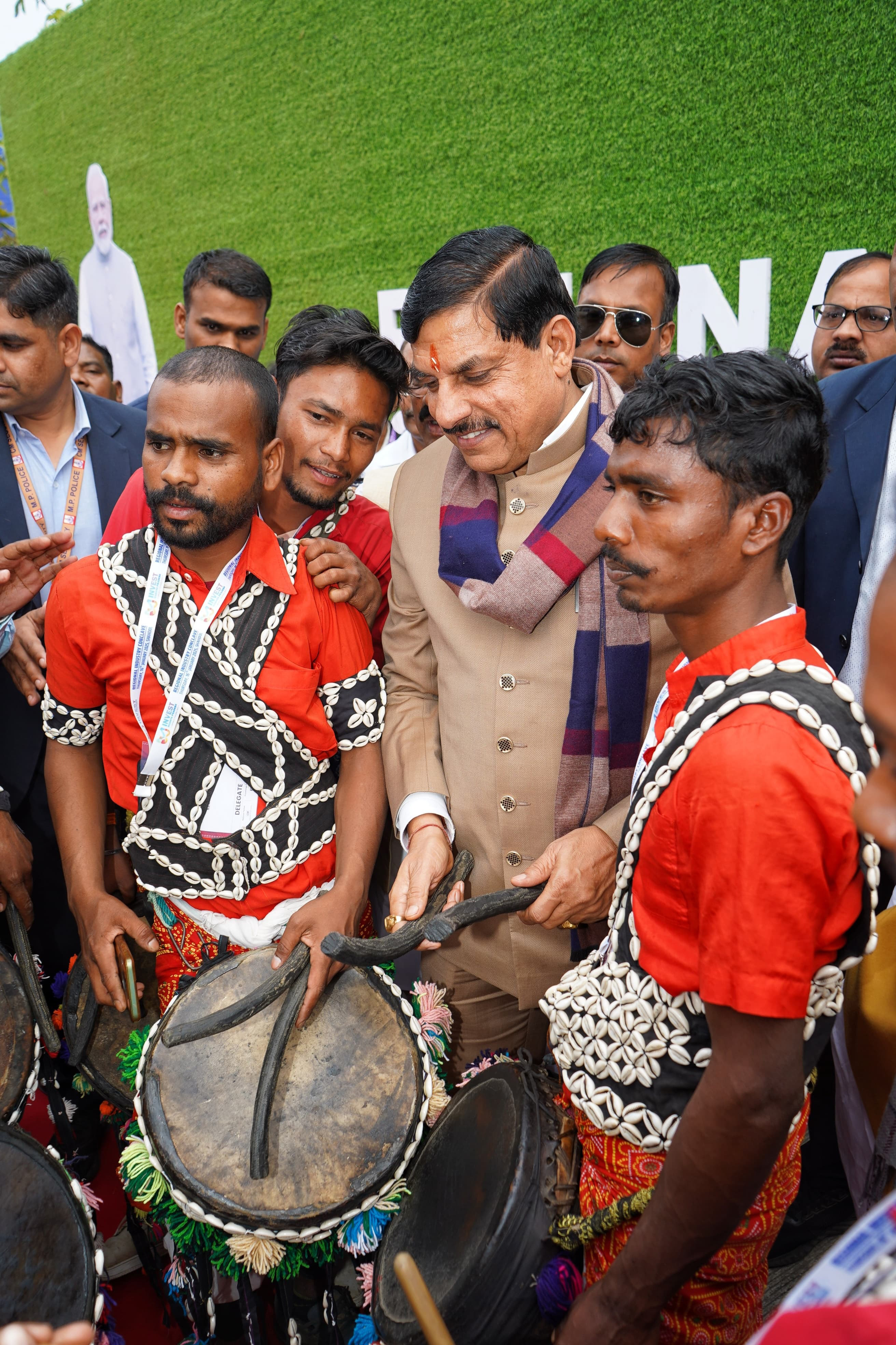 मुख्यमंत्री डॉ मोहन यादव ने शहडोल रीजनल इंडस्ट्री कॉन्क्लेव के अवसर पर पारंपरिक वाद्य यंत्र बजाते जनजातीय युवाओं का उत्साहवर्धन किया।