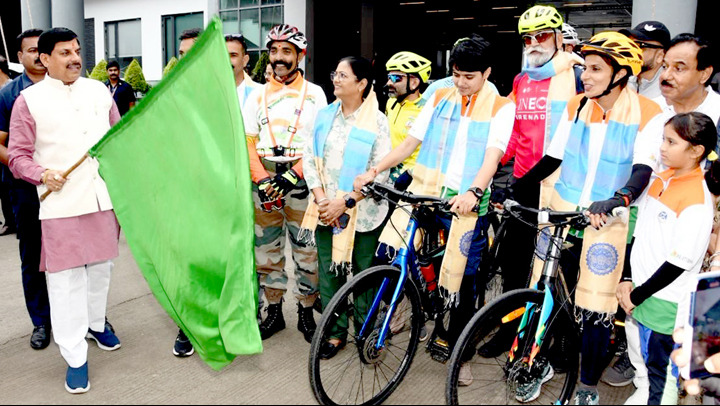मुख्यमंत्री डॉ. मोहन यादव ने मुख्यमंत्री निवास परिसर से पूर्व अंतर्राष्ट्रीय पर्वतारोही सुश्री अंजना यादव को पैडल टू प्लांट कार्यक्रम- नया भारत हरा भारत यात्रा के लिए हरी झंडी दिखाकर रवाना किया।