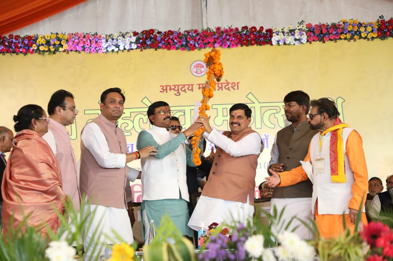 मुख्यमंत्री डॉ. मोहन यादव का दमोह के नोहटा में नोहलेश्वर महोत्सव मेले में नागरिकों ने ग़जमाला के साथ हल भेंट कर अभिनंदन किया।
